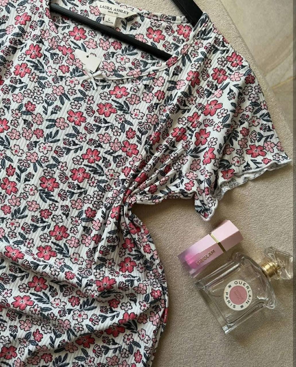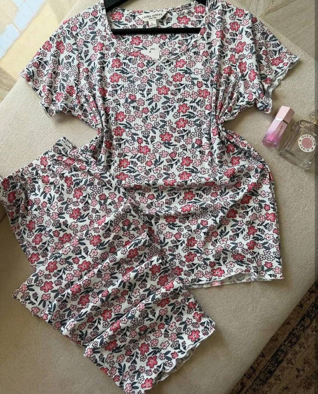 Cet ensemble pyjama deux pièces se distingue par son style romantique et printanier, typique de l’esthétique florale de la marque.