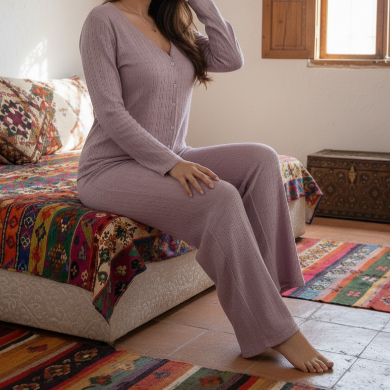 Ensemble Pyjama « Lilac Softness » – Mauve Poudré & Maille Texturée