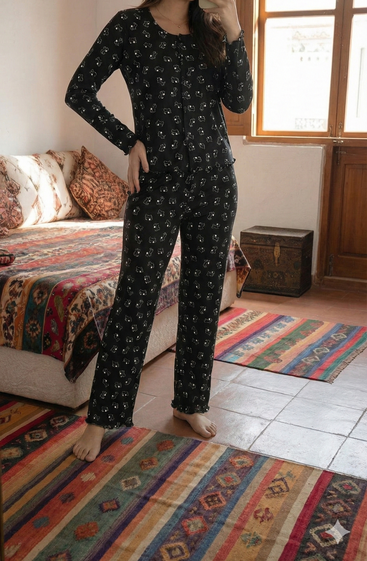 Qui peut résister à ce motif ? Cet ensemble combine l’élégance intemporelle du noir avec une touche de douceur enfantine qui fait sourire. C’est la tenue idéale pour vos dimanches détente, vos soirées chocolat chaud ou simplement pour vous sentir « mignonne à croquer » à la maison.