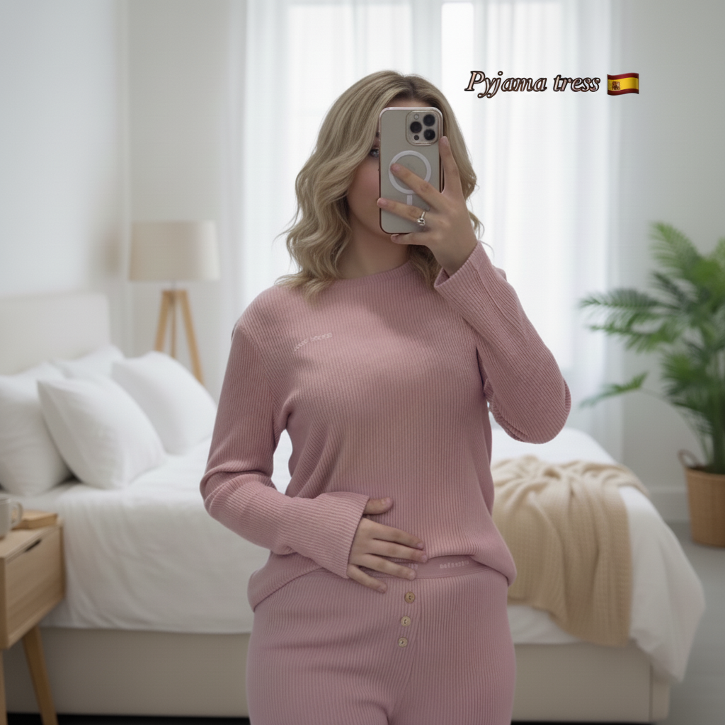 Le haut à manches longues, au tombé fluide, apporte une sensation de chaleur légère idéale pour les moments de détente. Le bas assorti, orné de jolis boutons décoratifs, ajoute une touche tendance et moderne à l’ensemble.