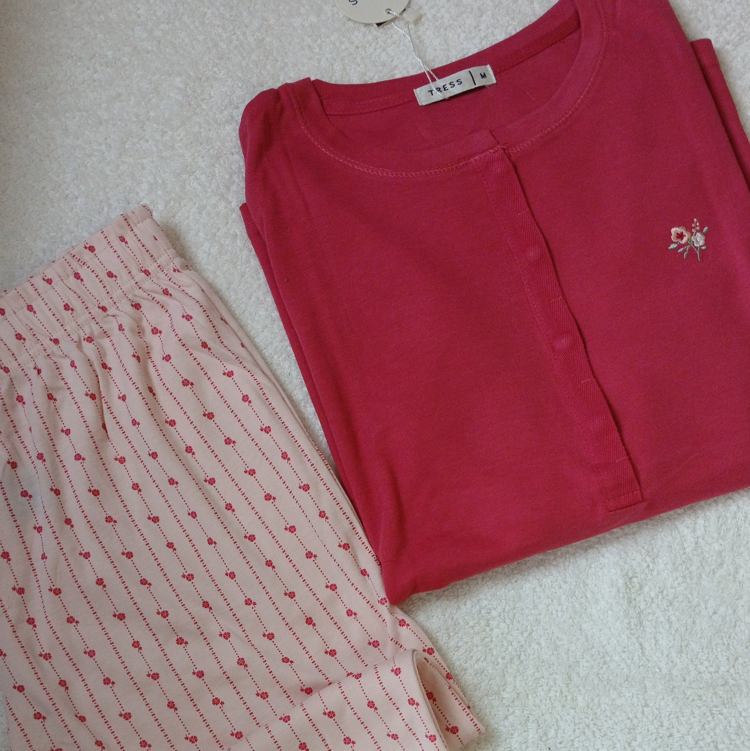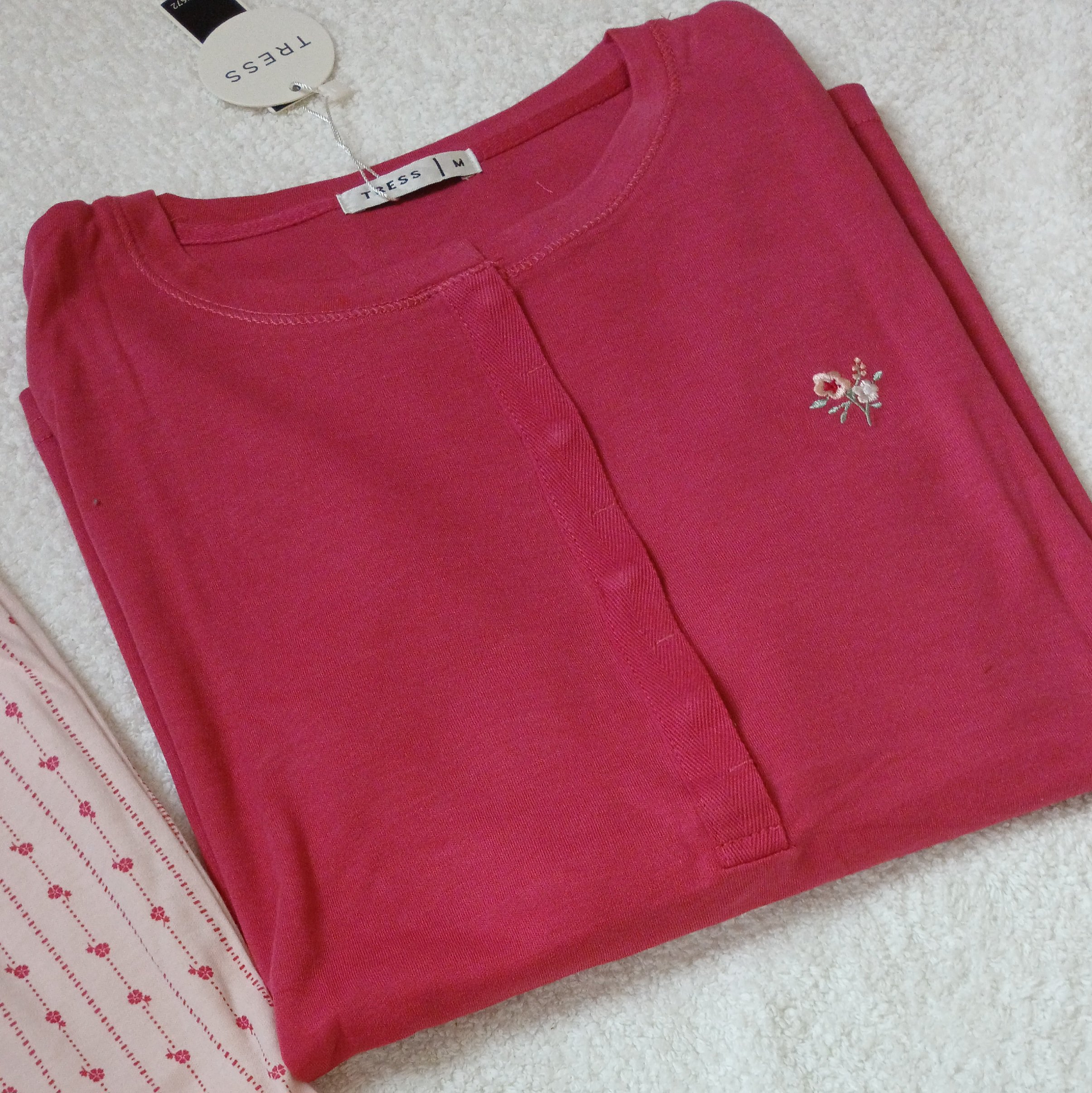 Laissez-vous séduire par ce pyjama TRESS au design féminin et raffiné. Composé d’un haut uni à manches longues avec une encolure boutonnée, il apporte une touche chic tout en restant ultra confortable. Le pantalon clair à motifs délicats ajoute une note douce et élégante, parfaite pour les moments de détente à la maison.